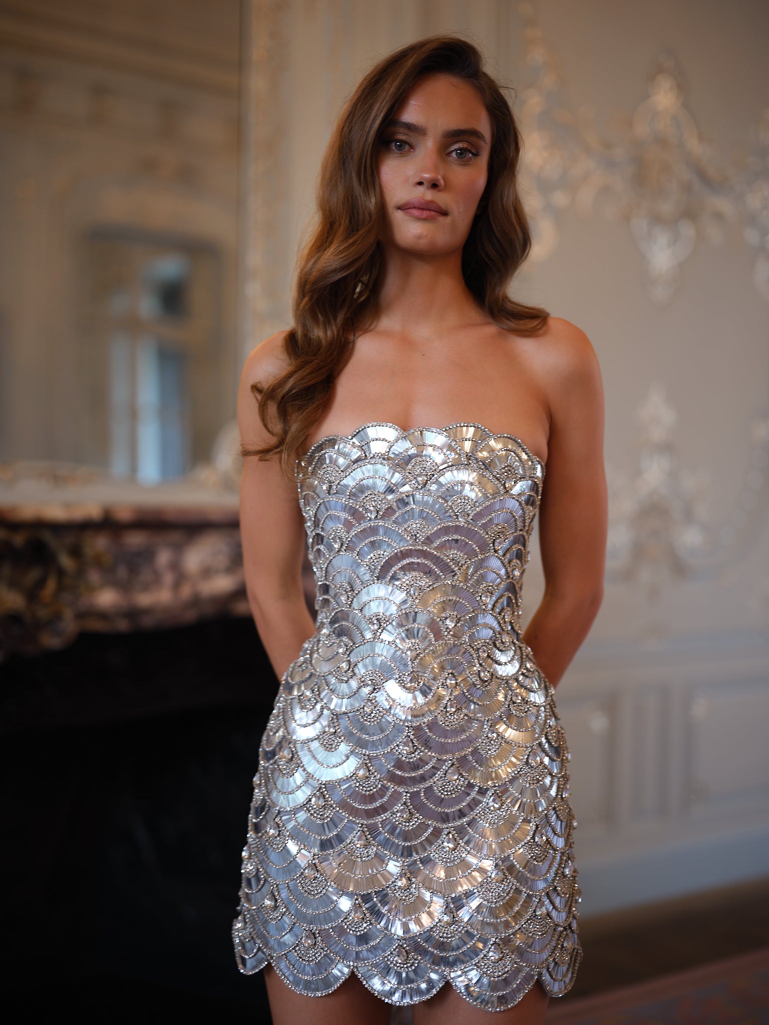 Each Adara is crafted by skilled artisans, requiring over 130 hours of handwork. The fan-shaped scallop design is built piece by piece, with every curve carefully constructed and adorned with rhinestones to create a fluid, mosaic-like surface of brilliance. The strapless silhouette highlights the form, while the reflective, scalloped layers catch the light with every movement, imitating waves of liquid silver.