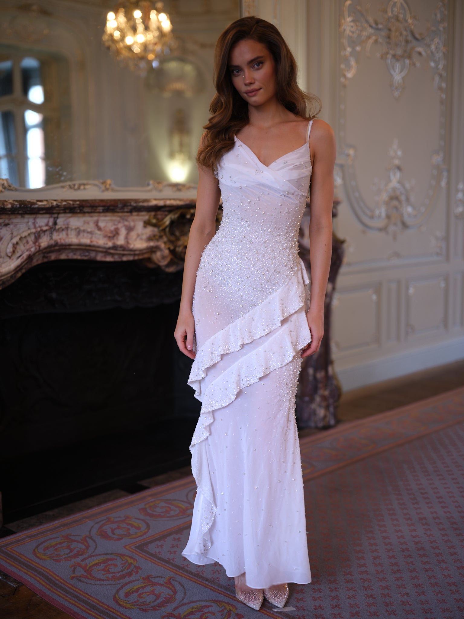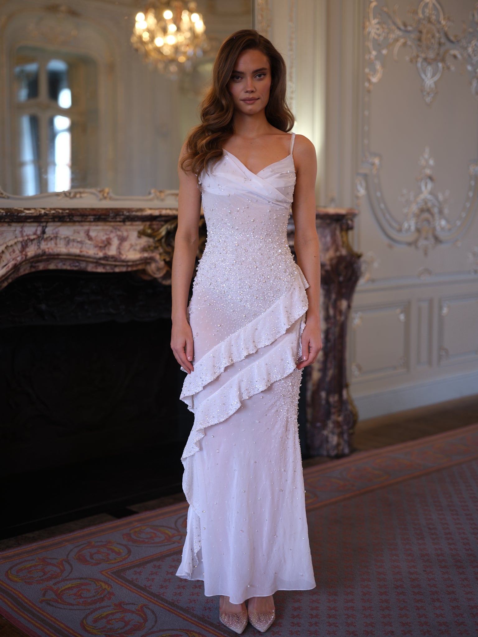 Taking over 145 hours of skilled artisan handwork, this breathtaking design is delicately encrusted with hand-placed crystals and beads layered over whisper-light chiffon. Each embellishment is thoughtfully positioned to create a luminous surface that sparkles subtly in motion, catching the light without overwhelming the softness of the silhouette.