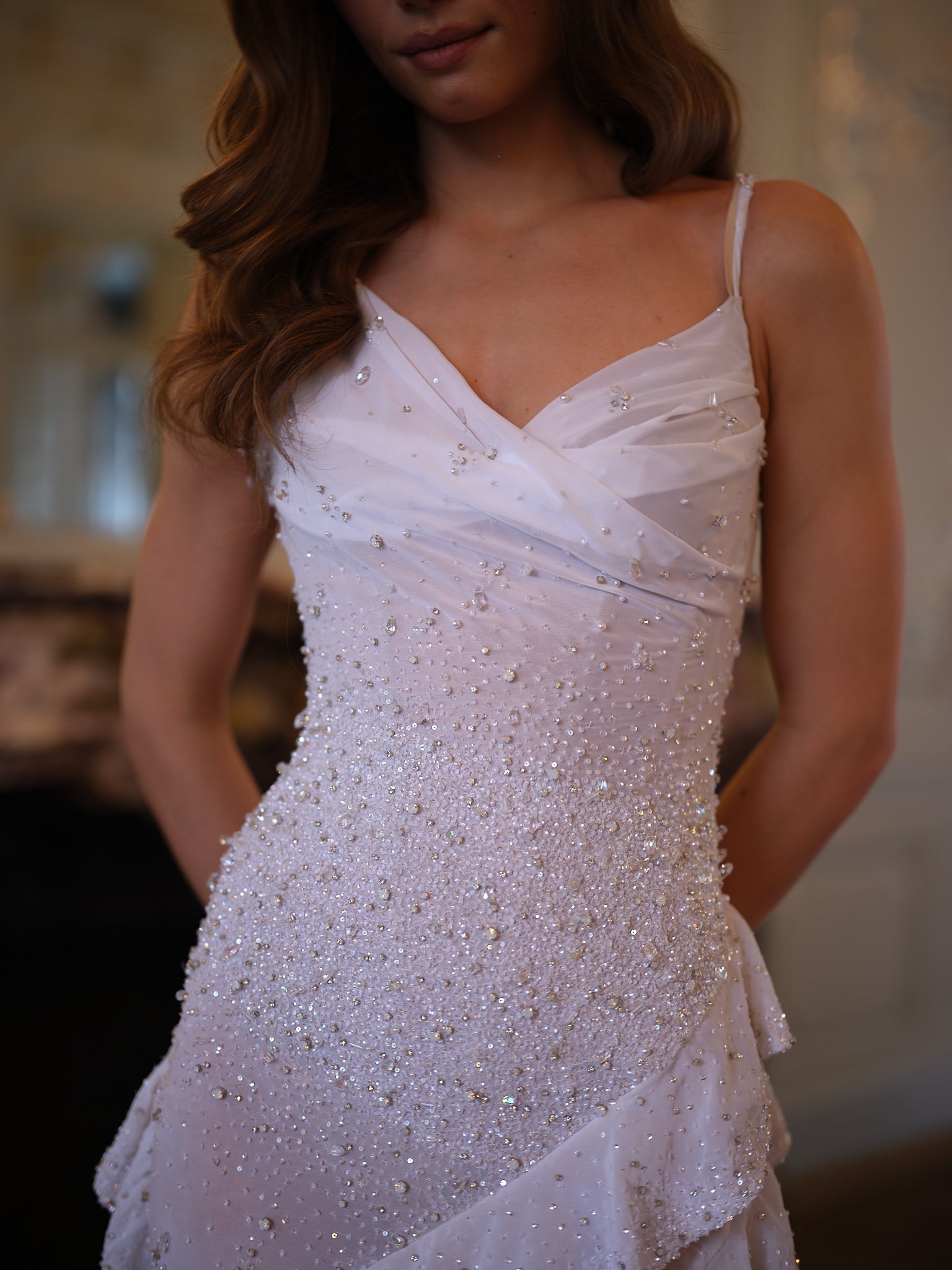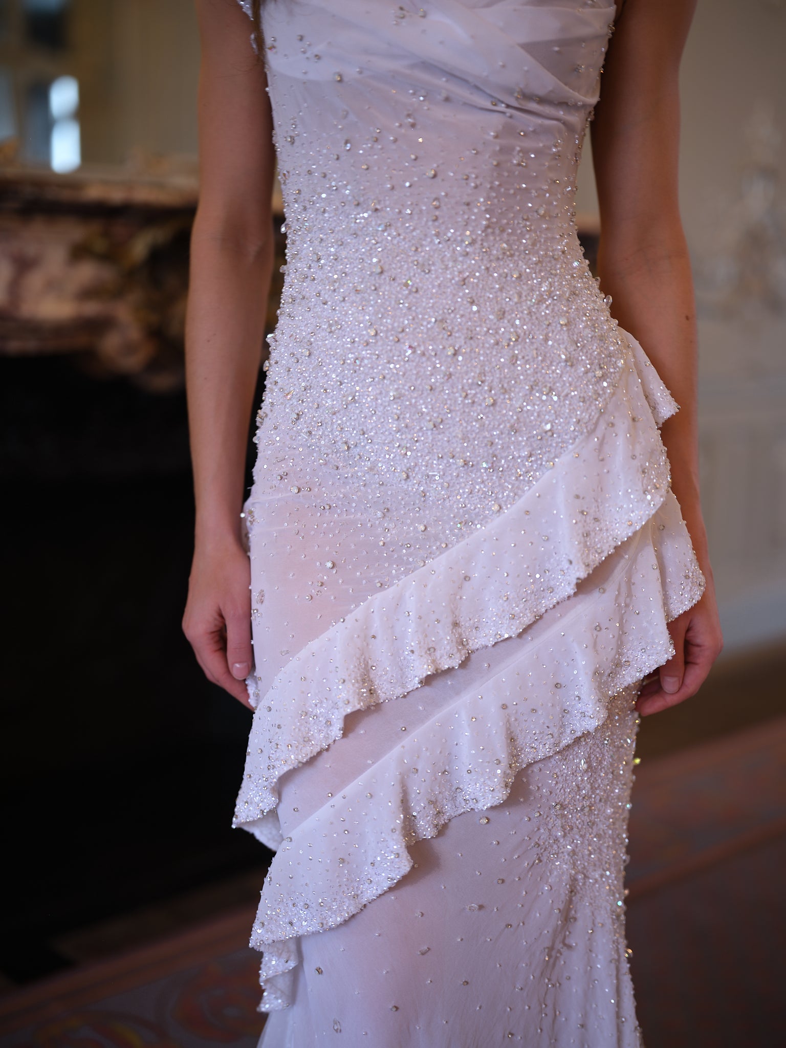 Embellishment: Hand-encrusted crystals and beads layered over chiffon