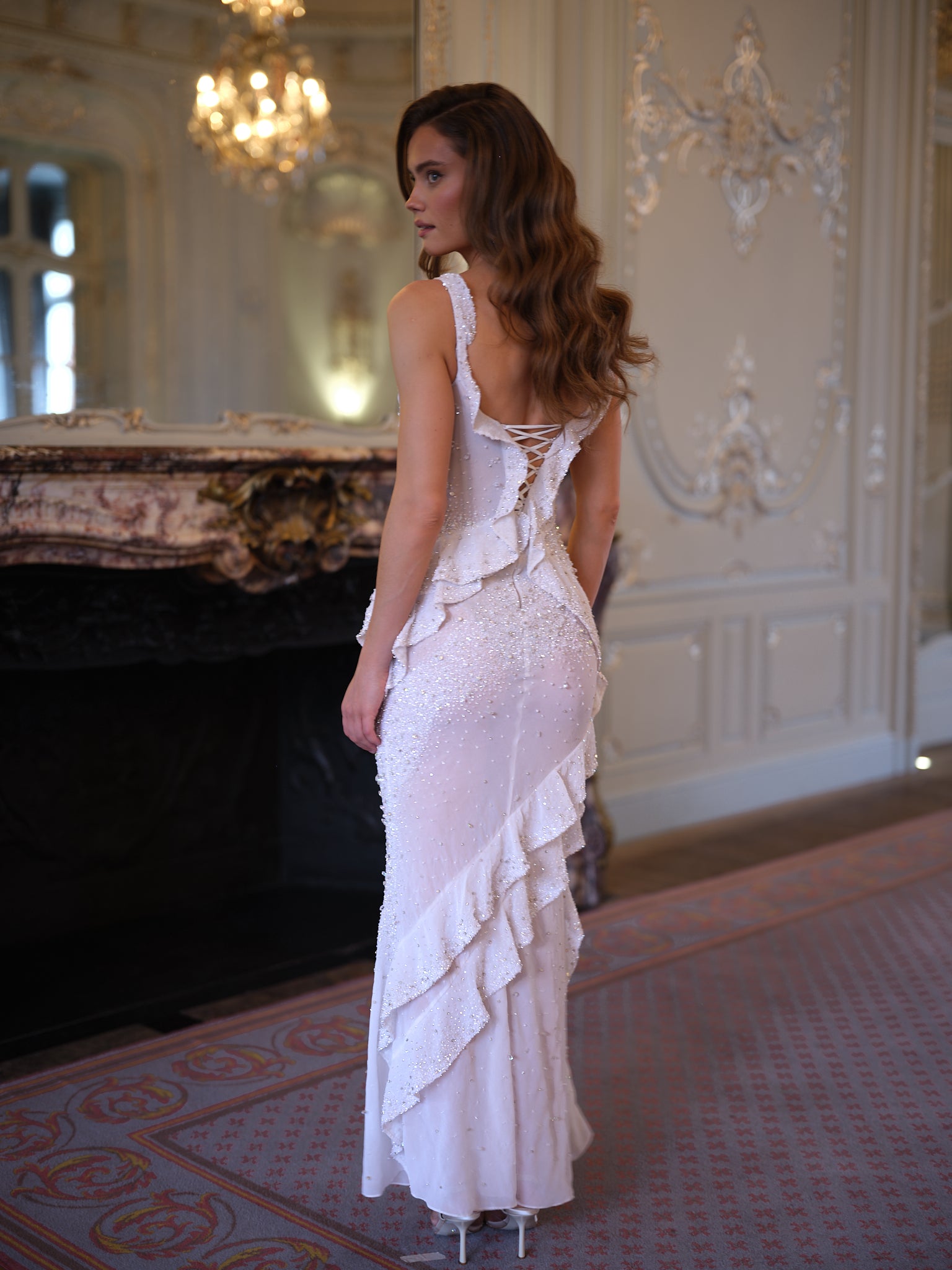 Silhouette: Softly contoured with cascading chiffon frills