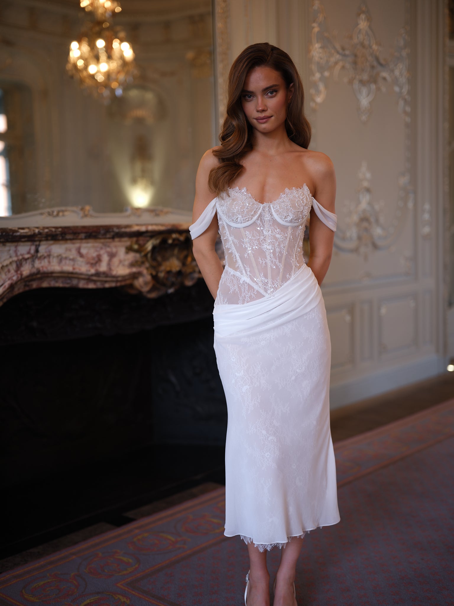 The Aria Midi is the elevated evolution of modern bridal femininity - combining delicate lace, structured corsetry, and fluid draping in a silhouette that feels both timeless and contemporary.