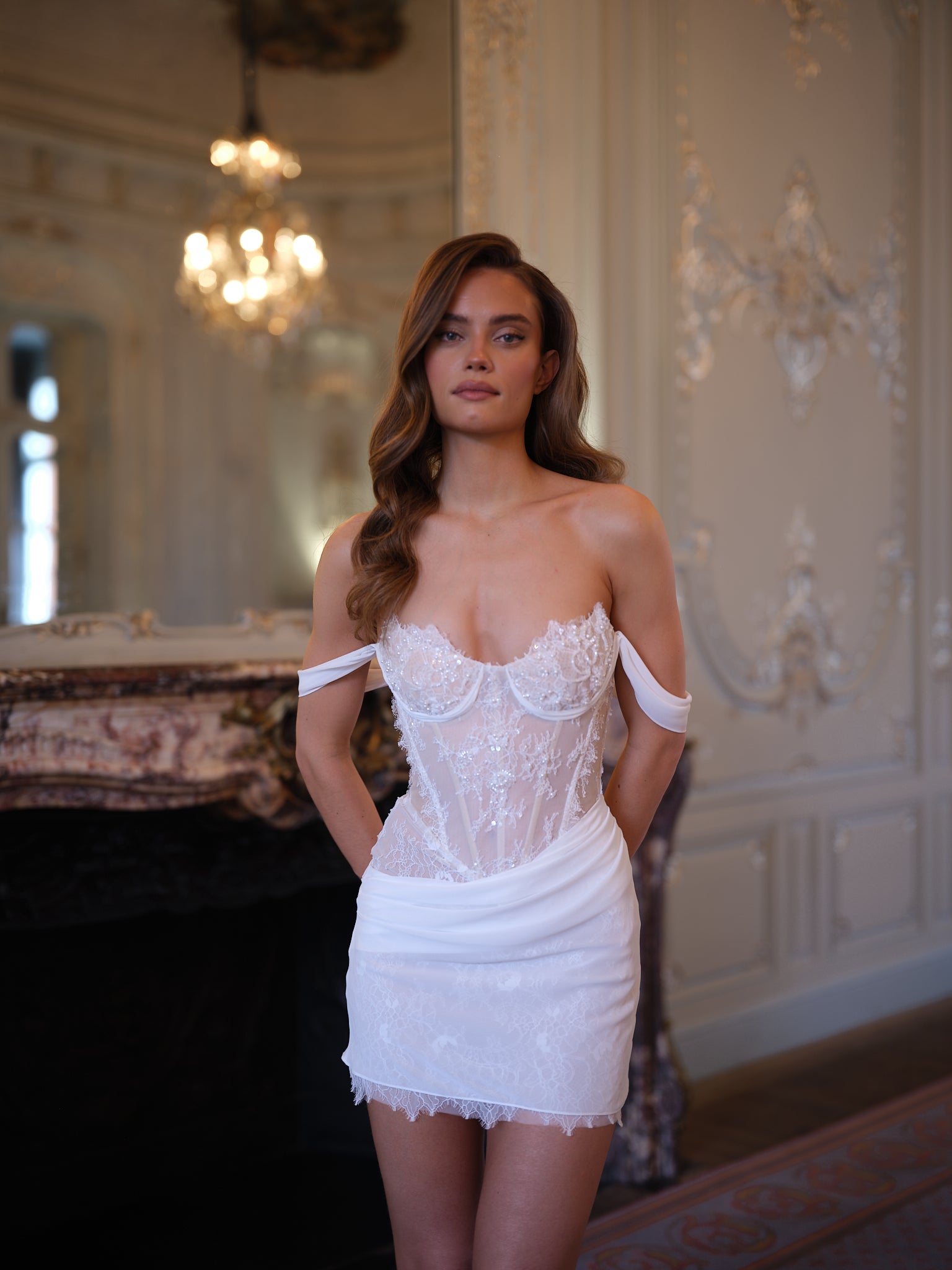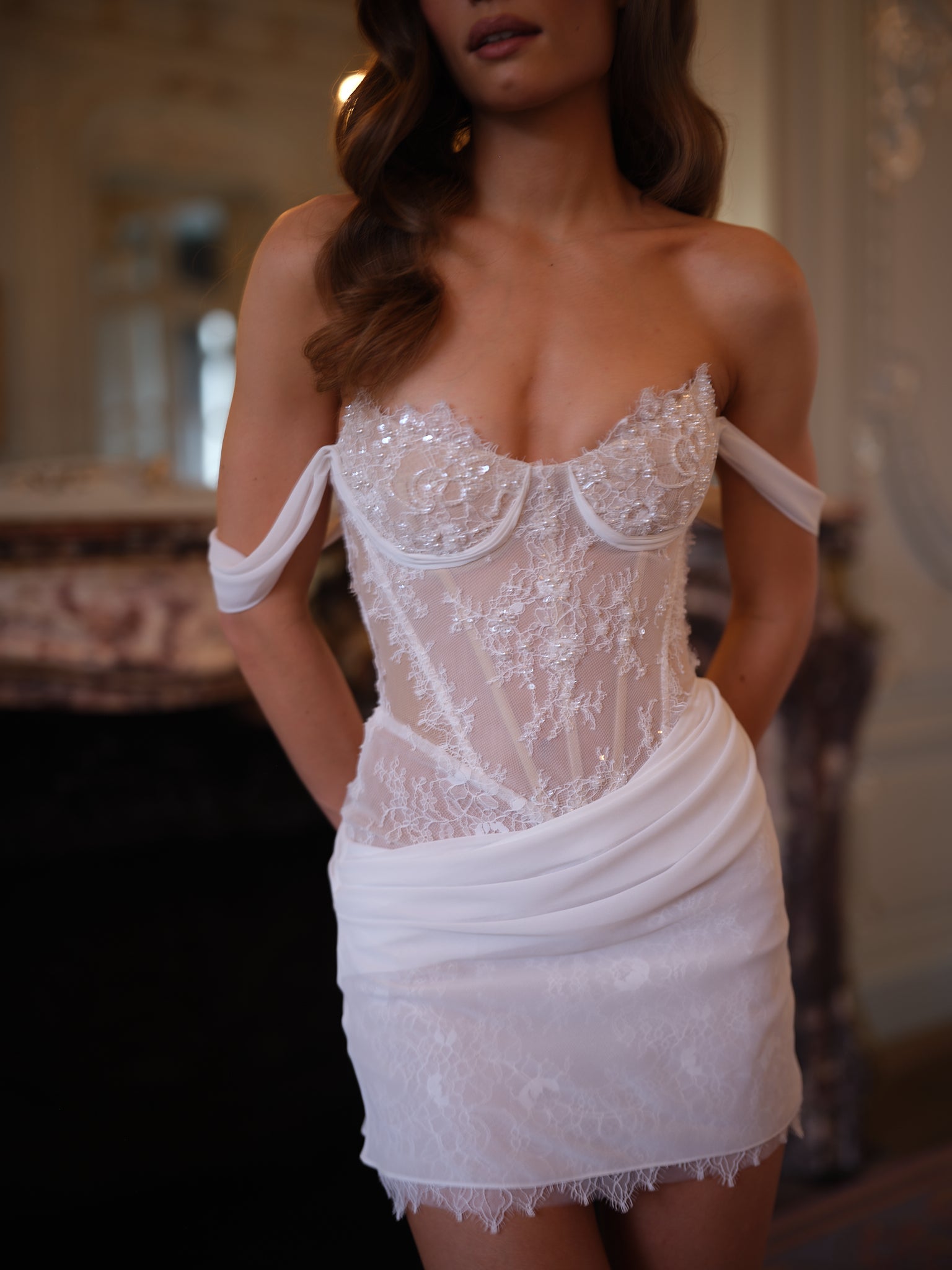 Off-shoulder chiffon arm drapes frame the neckline with effortless grace, balancing the structured bodice with fluid softness. The mini skirt is finished with a delicate lace hem and a gently draped chiffon overlay at the waist, adding texture and movement while flattering the hips.