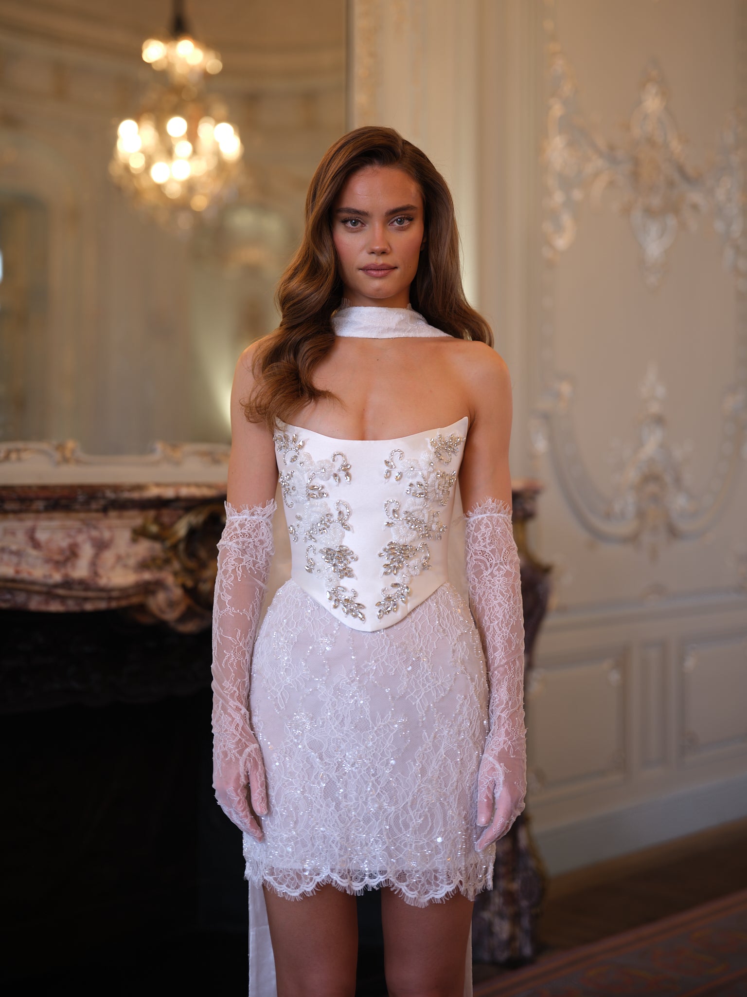 The Everly Lace Mini is the embodiment of refined bridal elegance with a fashion-forward edge. Designed for the bride who embraces classic romance while commanding attention, Everly is equal parts sophistication and statement.