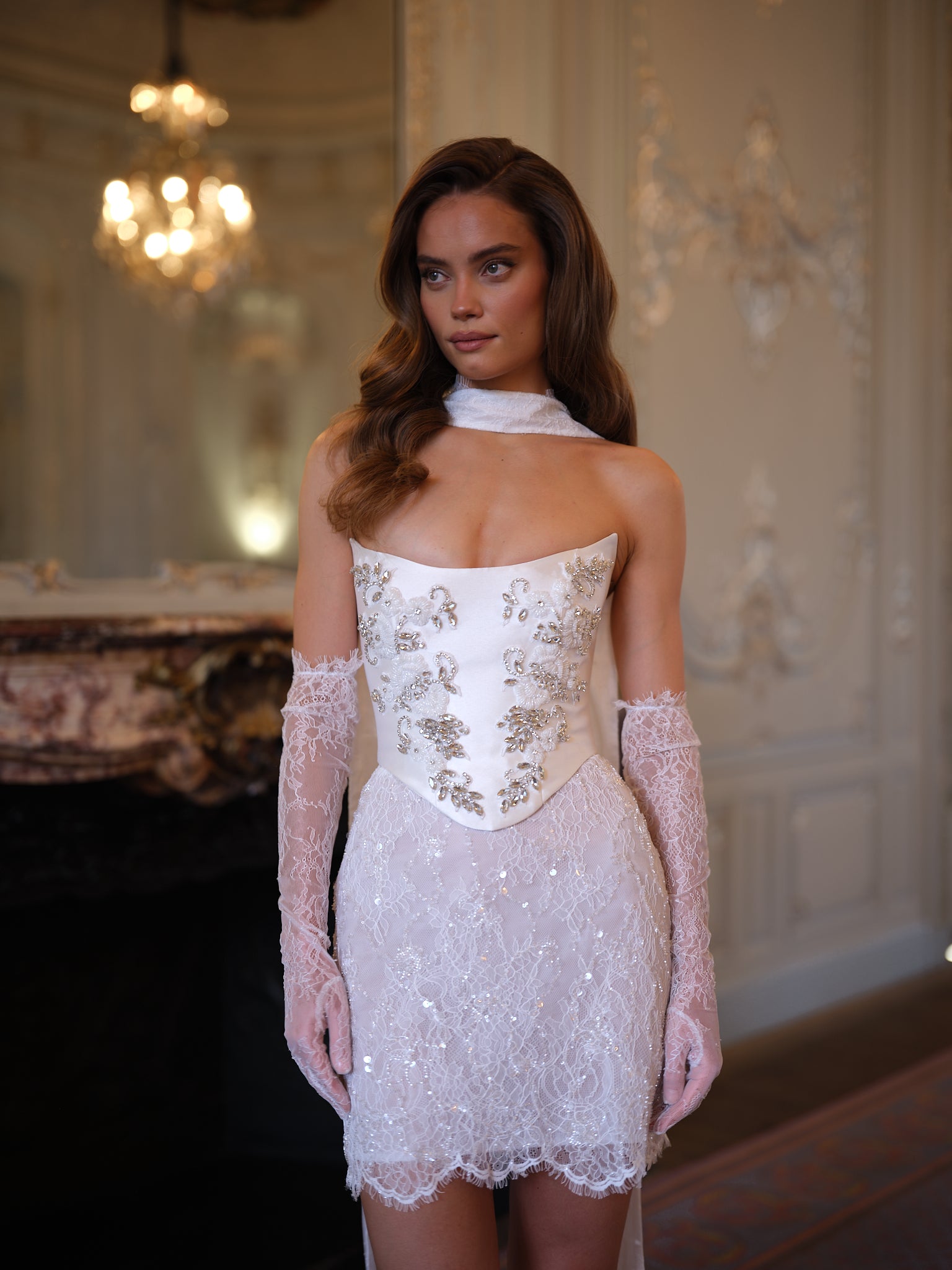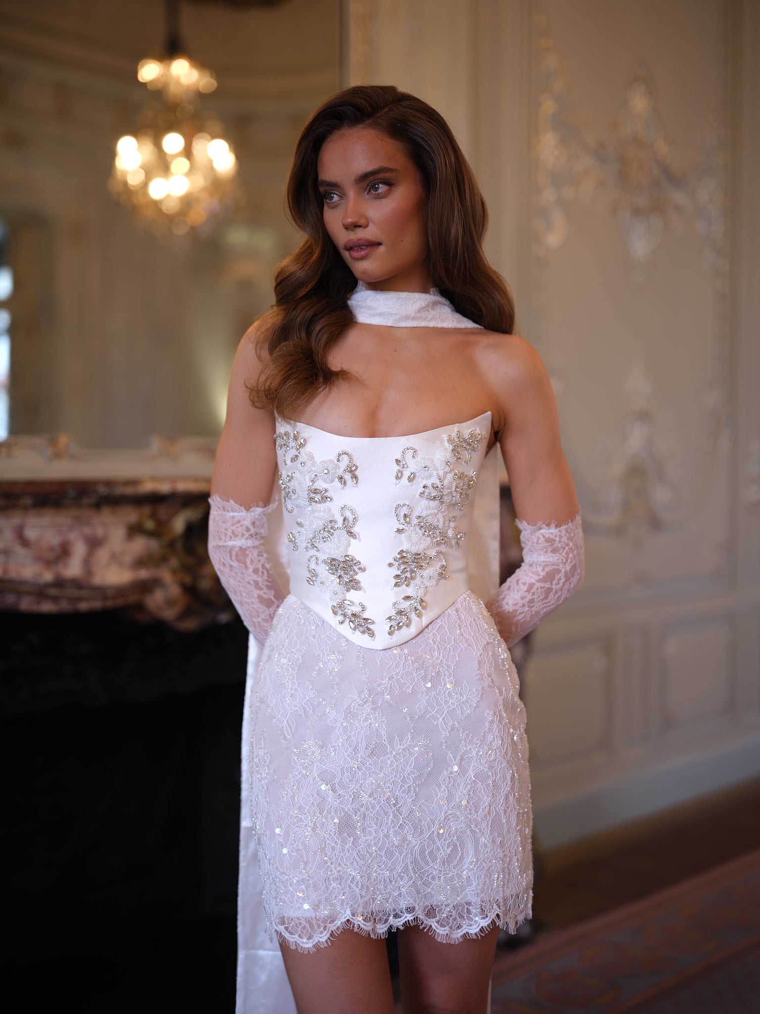Crafted from delicately detailed lace, the mini silhouette is sculpted to flatter and contour, offering a clean yet feminine shape that feels effortlessly elevated. The structured bodice provides subtle support and shaping, while the intricate lace overlay adds texture, depth, and softness against the skin. Paired with matching lace gloves and a coordinating neck scarf, Everly becomes a complete couture look - styled to frame the shoulders and elongate the neckline with graceful drama.