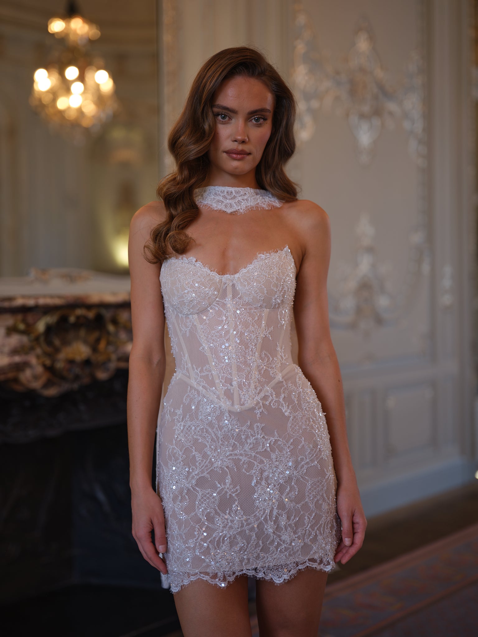 This strapless silhouette highlights a sculpted corset bodice with sheer paneling and precise boning for a flawlessly contoured fit. Intricately embroidered lace overlays shimmer with sequin embellishment, scattering light across every movement. The scalloped mini hem softens the bold structure, while the matching lace neck scarf adds a touch of Parisian-inspired elegance—polished yet playfully unexpected.