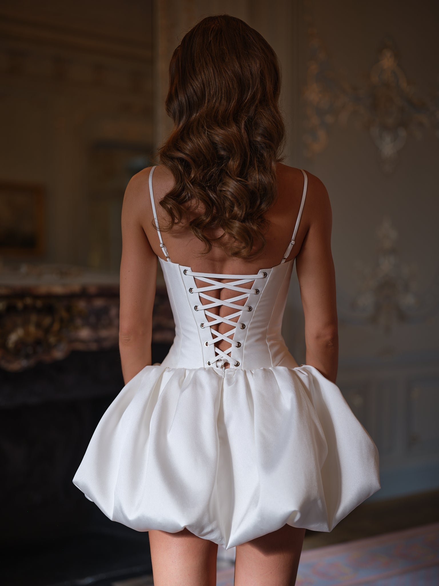 The dress features a structured corset bodice seamlessly fused with the voluminous satin puff skirt, creating a silhouette that’s both architectural and feminine. The fitted bodice sculpts the waist with precision, while delicate straps frame the décolletage for a refined finish. At the hem, the bubble-inspired skirt adds movement and dimension, turning each step into a statement of high-style bridal chic.
