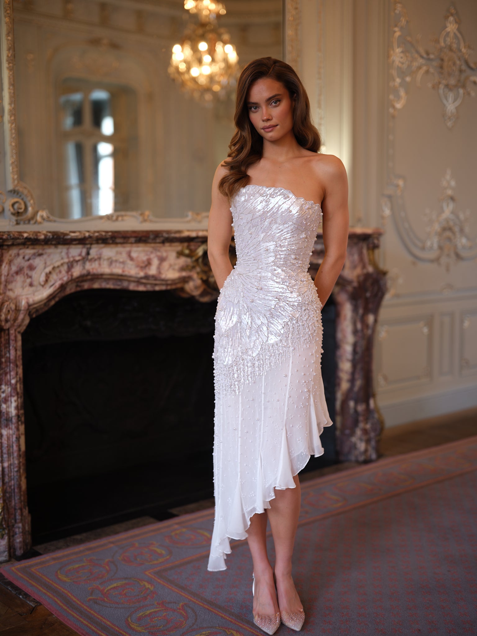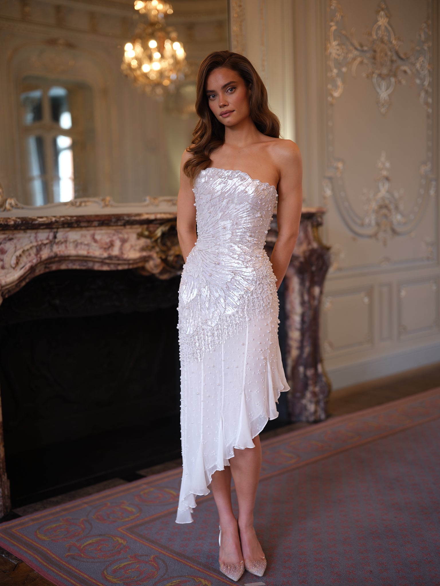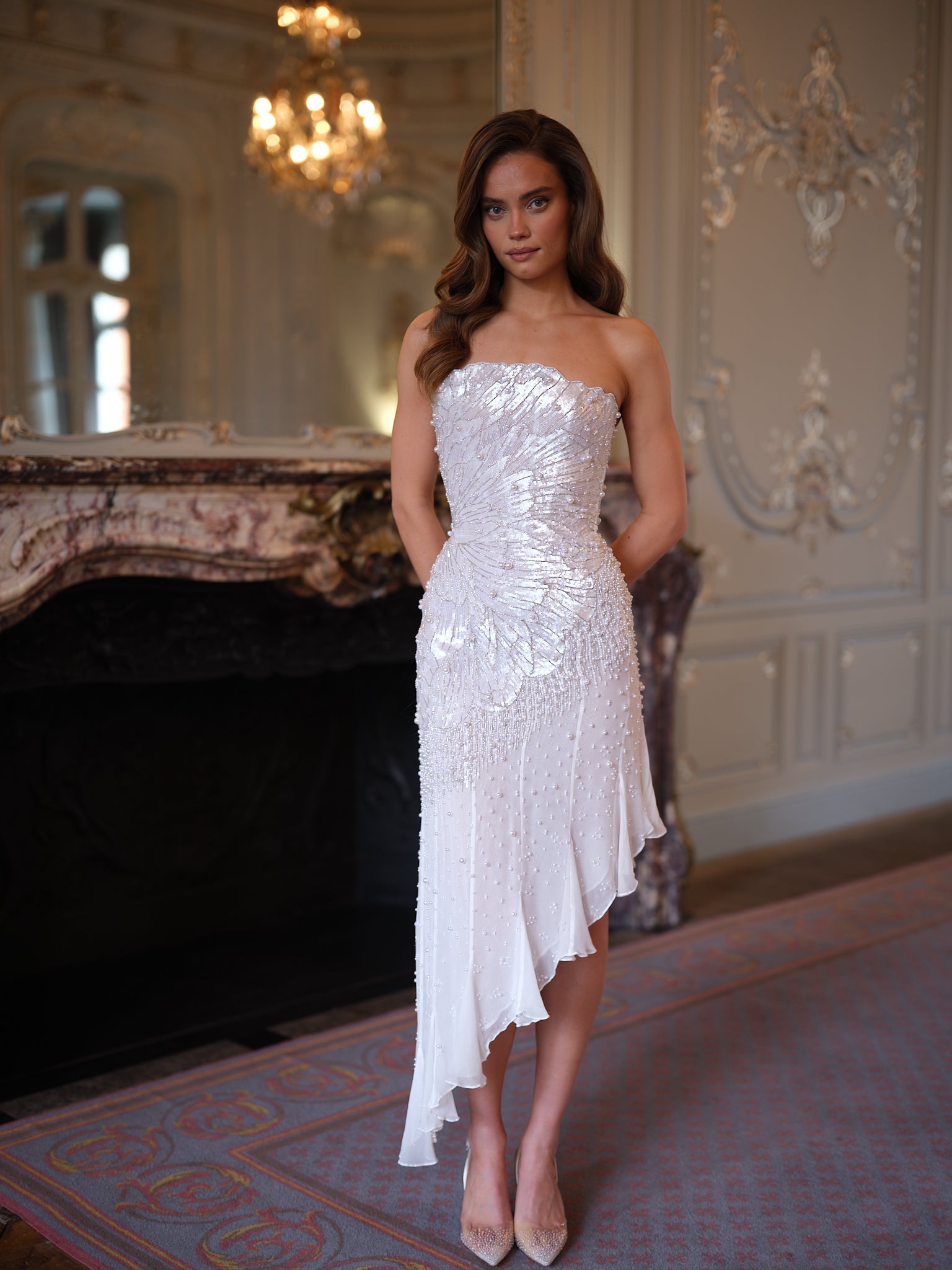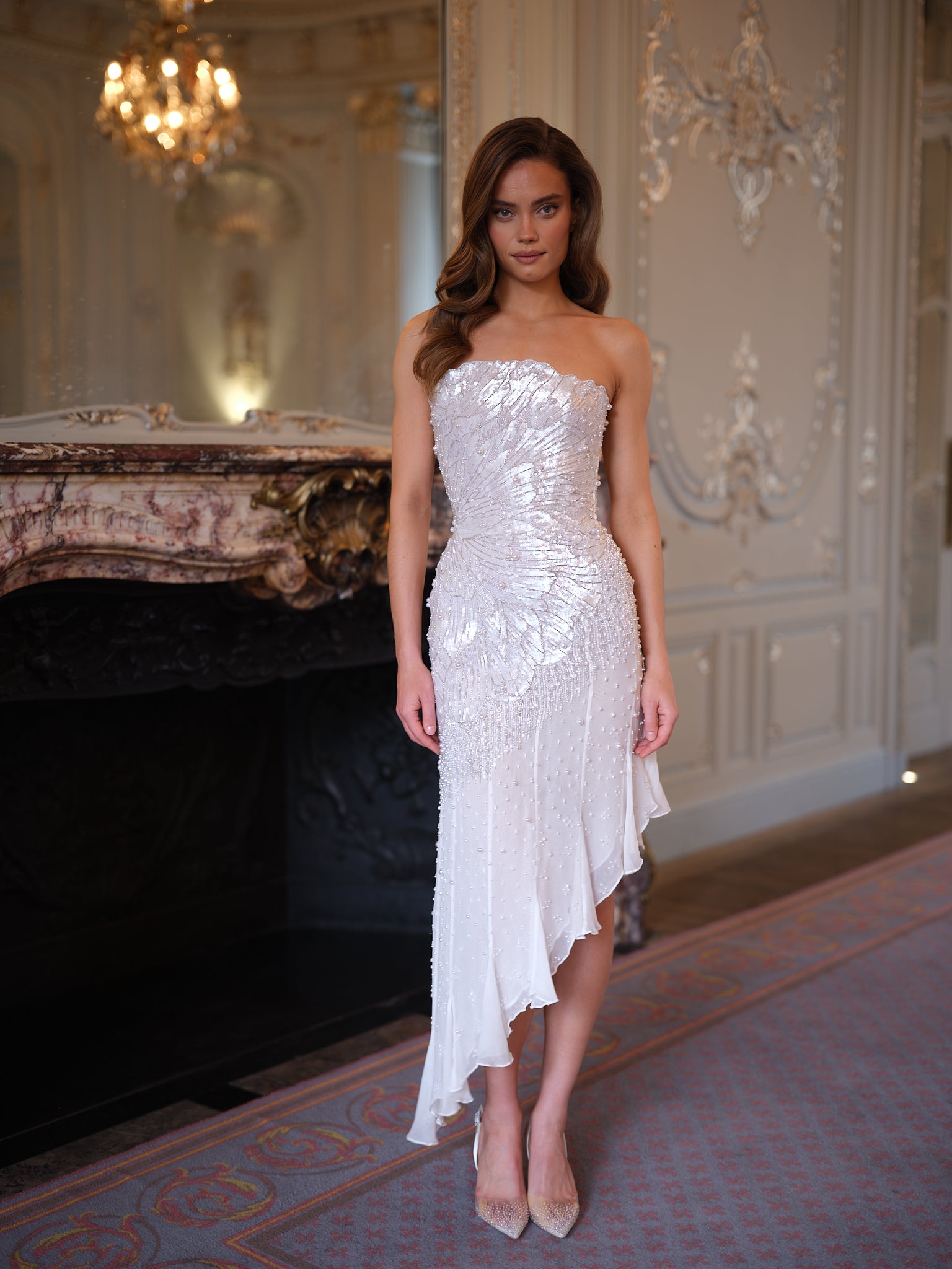 The flowing chiffon skirt drapes effortlessly, designed to float and move with each step. An asymmetric hemline enhances the sense of movement, adding a contemporary edge to the romantic silhouette while elongating the leg.