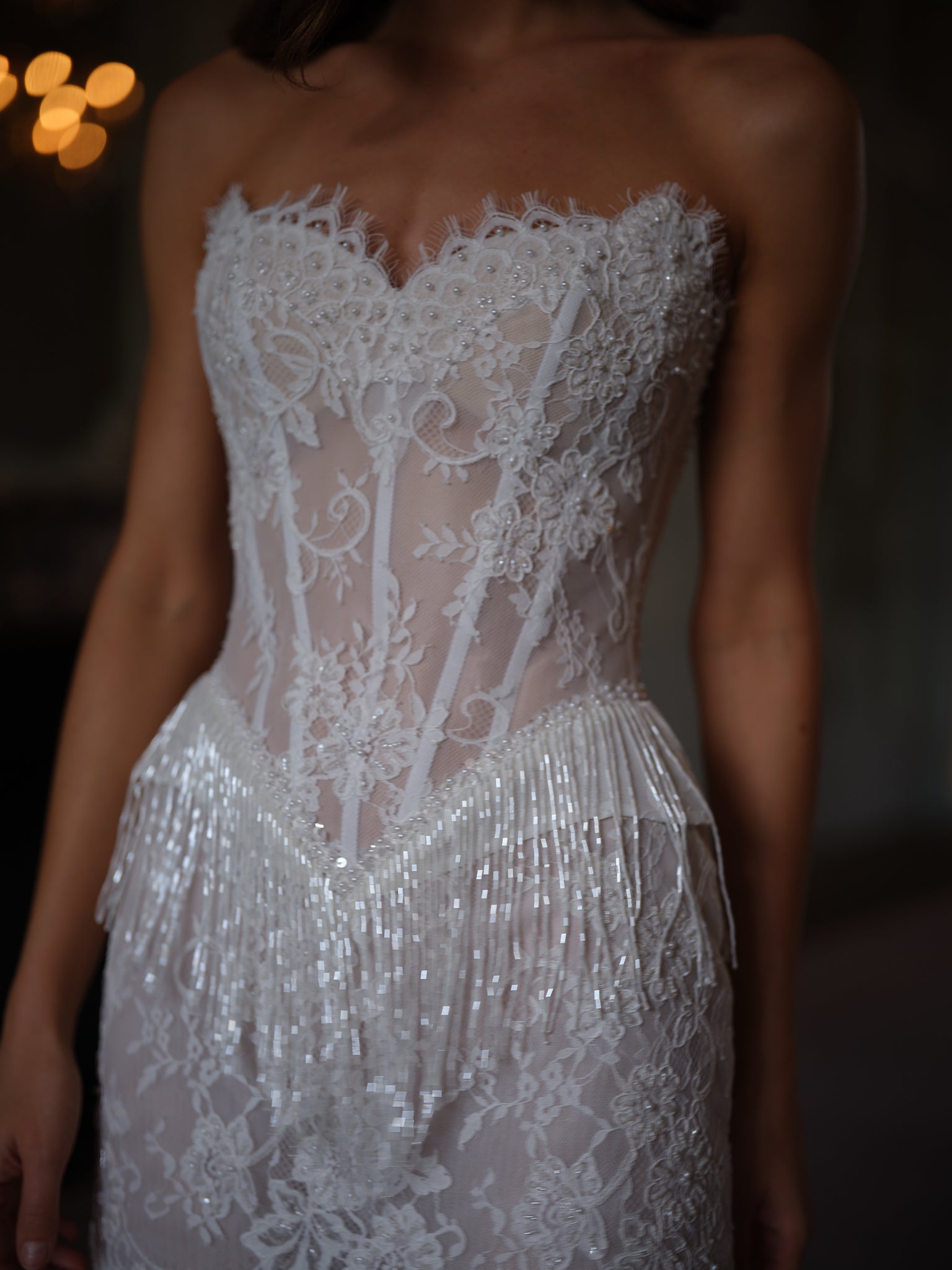 This strapless corset silhouette is sculpted with sheer lace paneling and structured boning, offering a figure-flattering fit that feels both bold and refined. The bodice flows seamlessly into a scalloped lace hem, while the addition of pearl and sequin-embellished tassel fringe transforms every movement into a statement—fluid, radiant, and irresistibly chic.