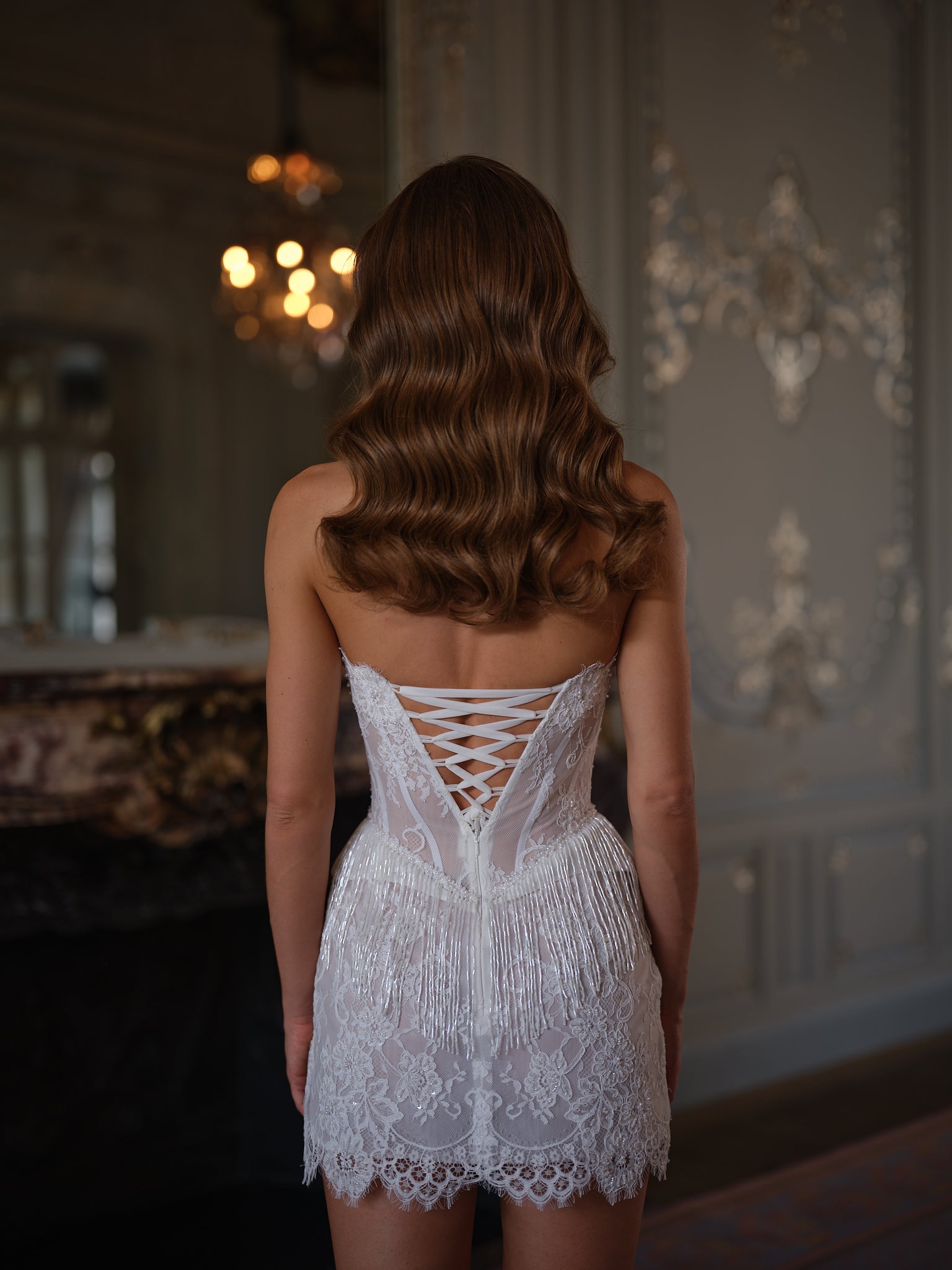 The Sienna Bridal Mini Dress is a dazzling expression of joy, designed for the bride who wants to sparkle, sway, and make every step unforgettable. With its fusion of couture lace and playful fringe, Sienna reimagines bridal elegance through the lens of glamour and celebration.
