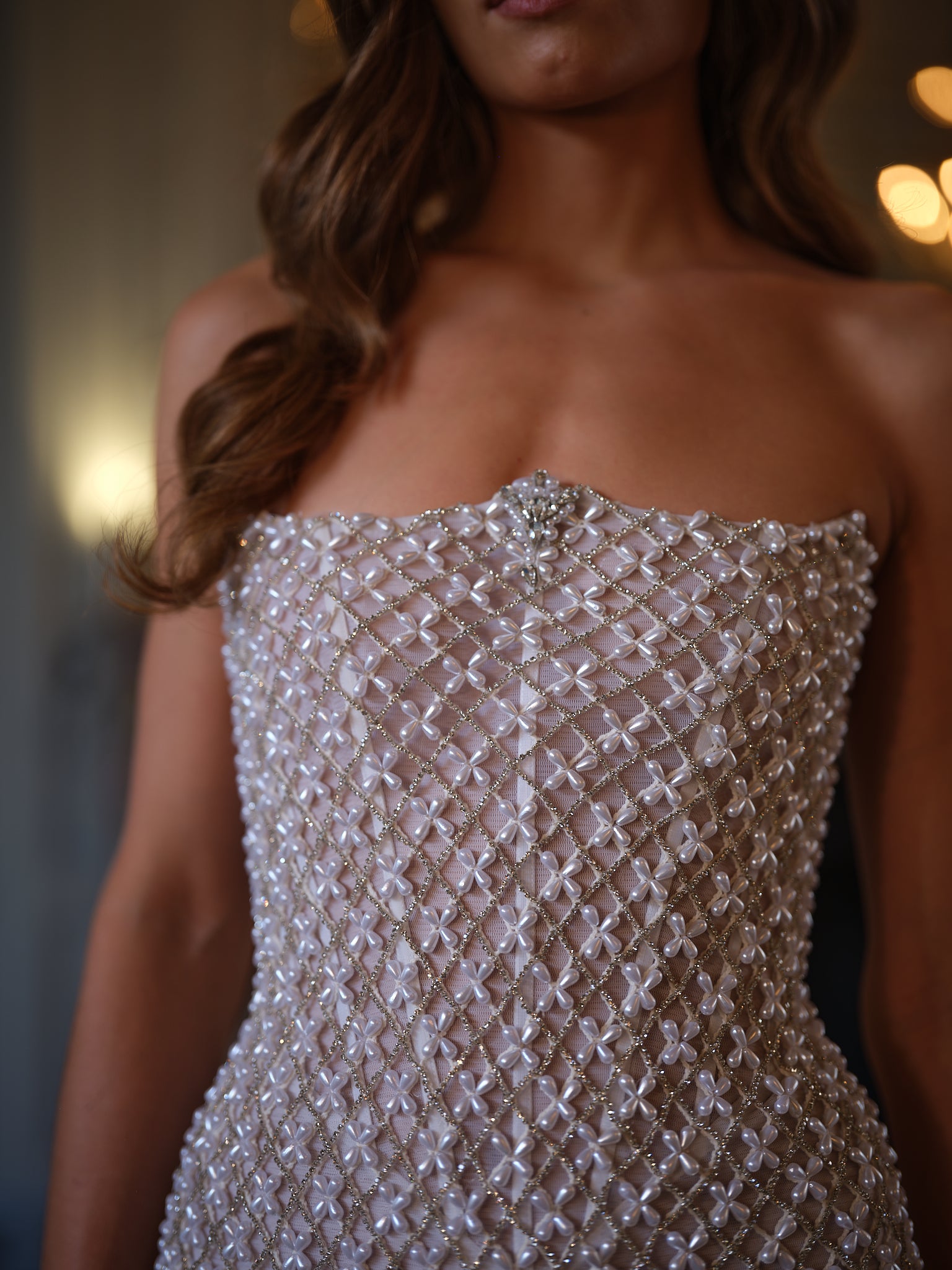 Requiring over 60 hours of meticulous handwork, skilled artisans weave together a delicate mesh of pearls and rhinestones, creating a fabric that glitters with dimension and texture. The strapless silhouette is both minimalist and striking, its clean lines allowing the embellishment to shine. At the center, a subtle focal point adds couture detailing, drawing the eye and refining the balance of the design.